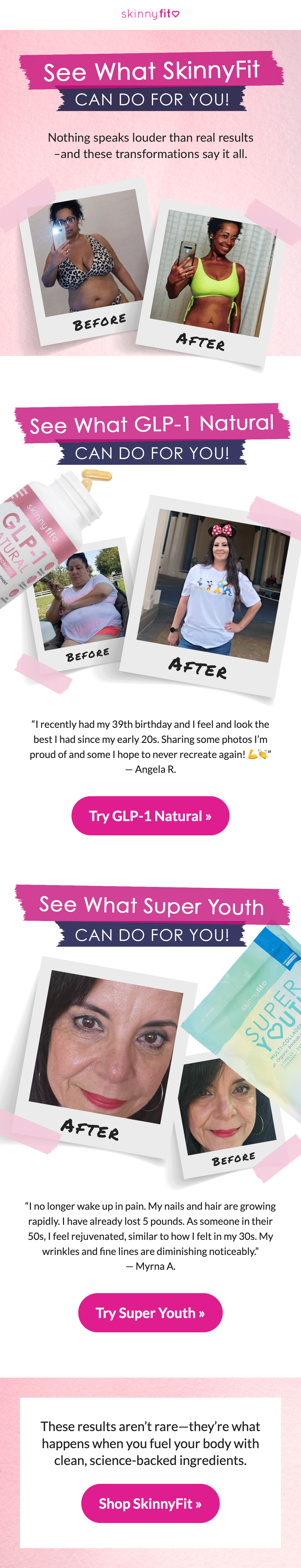 GLP-1 Natural quickly became one of SkinnyFit’s most in-demand products, and designing the launch emails was both exciting and creatively energizing. With so much anticipation around the formula, I crafted a series that highlighted its science-backed benefits, natural ingredients, and how it supports appetite control and balanced energy throughout the day. The emails balanced education with bold, eye-catching visuals to match the product’s momentum, making the launch feel as impactful and buzz-worthy as the product itself.
