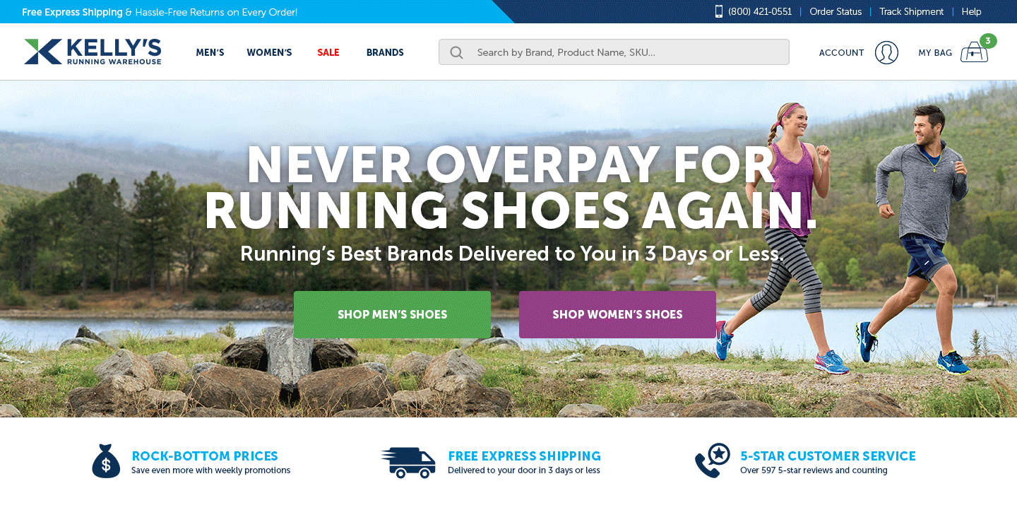 The Sale section highlights limited-time offers and discounted products, giving visitors a clear and compelling reason to convert. By showcasing the markdown price alongside the original retail value, the design emphasizes savings while reinforcing Kelly’s Running Warehouse’s position as the ultimate destination for high-quality gear at unbeatable prices.