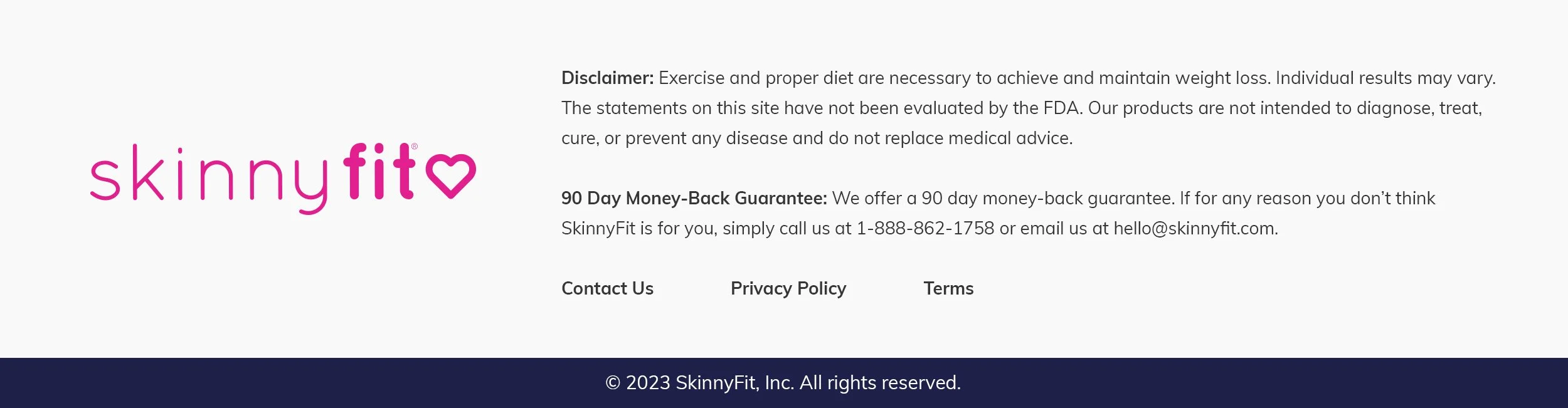 The footer was redesigned to be cleaner, more organized, and far easier to read. The previous landers didn’t feature the SkinnyFit logo anywhere on the page, so I incorporated it here to strengthen brand recognition and create a more cohesive experience. By simplifying the layout and improving legibility, this new footer provides a polished, trustworthy ending to the page while reinforcing the SkinnyFit identity.