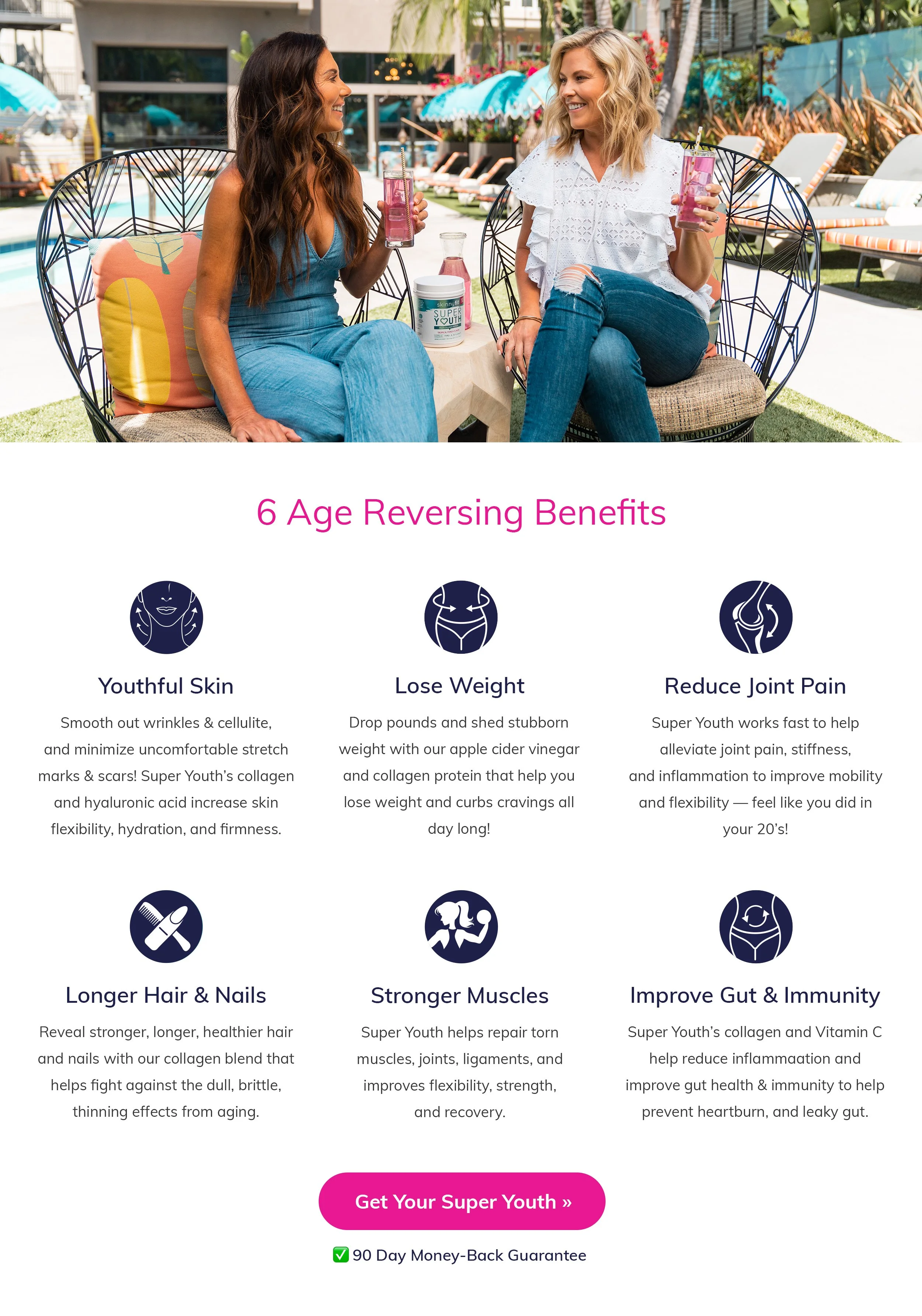 SkinnyFit’s collagens stand out by including all five types — I, II, III, V, and X — giving users a more complete, full-spectrum formula than most options on the market. To spotlight this differentiator, this section uses a split layout with benefit-driven content on the left and an aspirational lifestyle image on the right. The design balances clear education with emotional appeal, helping users understand both what’s inside the product and why it matters for their results.