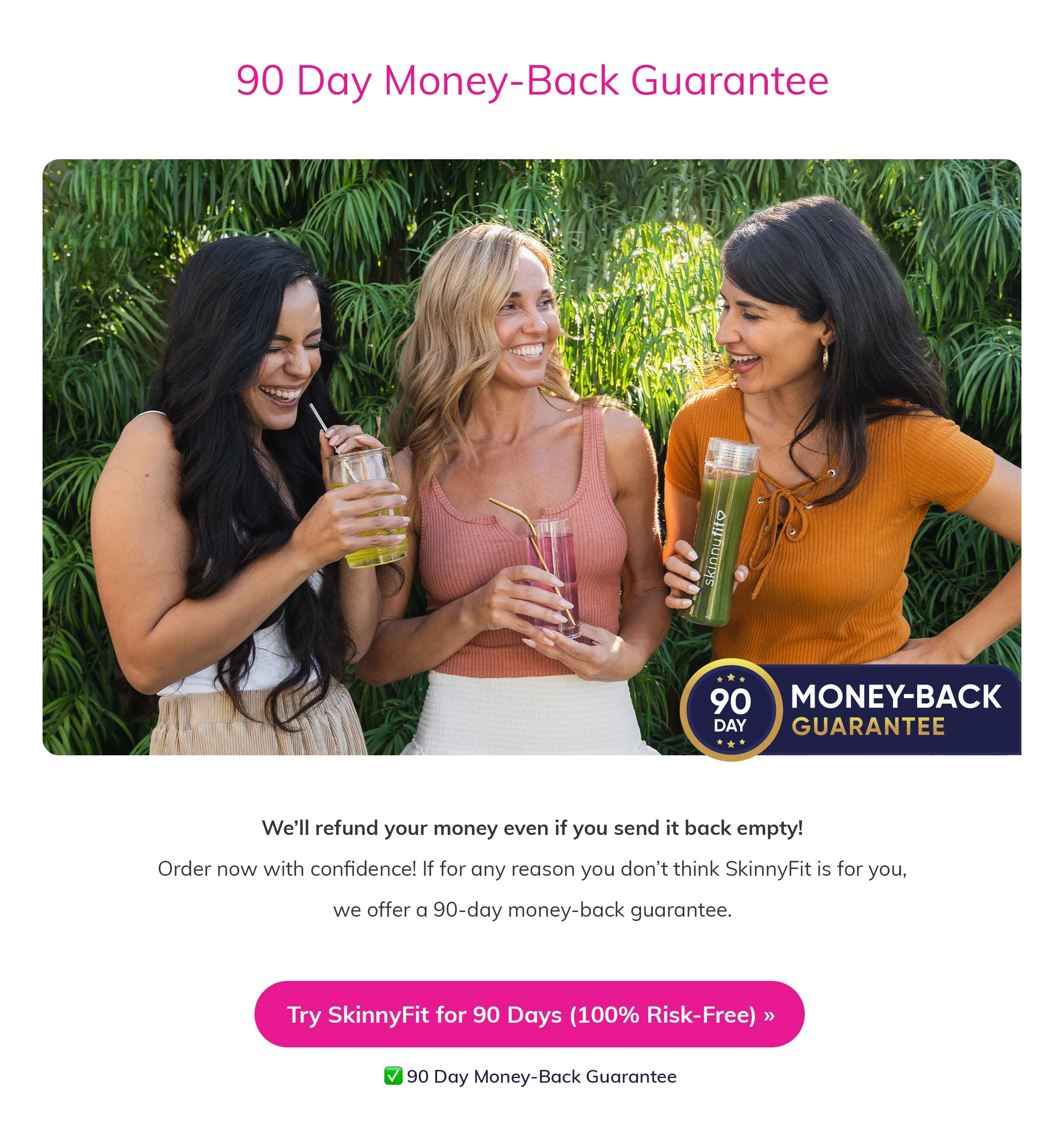 The 90-day money-back guarantee is one of SkinnyFit’s strongest conversion drivers, reducing hesitation and giving customers confidence to buy risk-free. In previous designs it wasn’t highlighted well, so I elevated this section with a warm lifestyle image of happy SkinnyFit customers to create a more inviting, trustworthy moment. Giving the guarantee more visual weight helps remove resistance and encourages users to move forward.