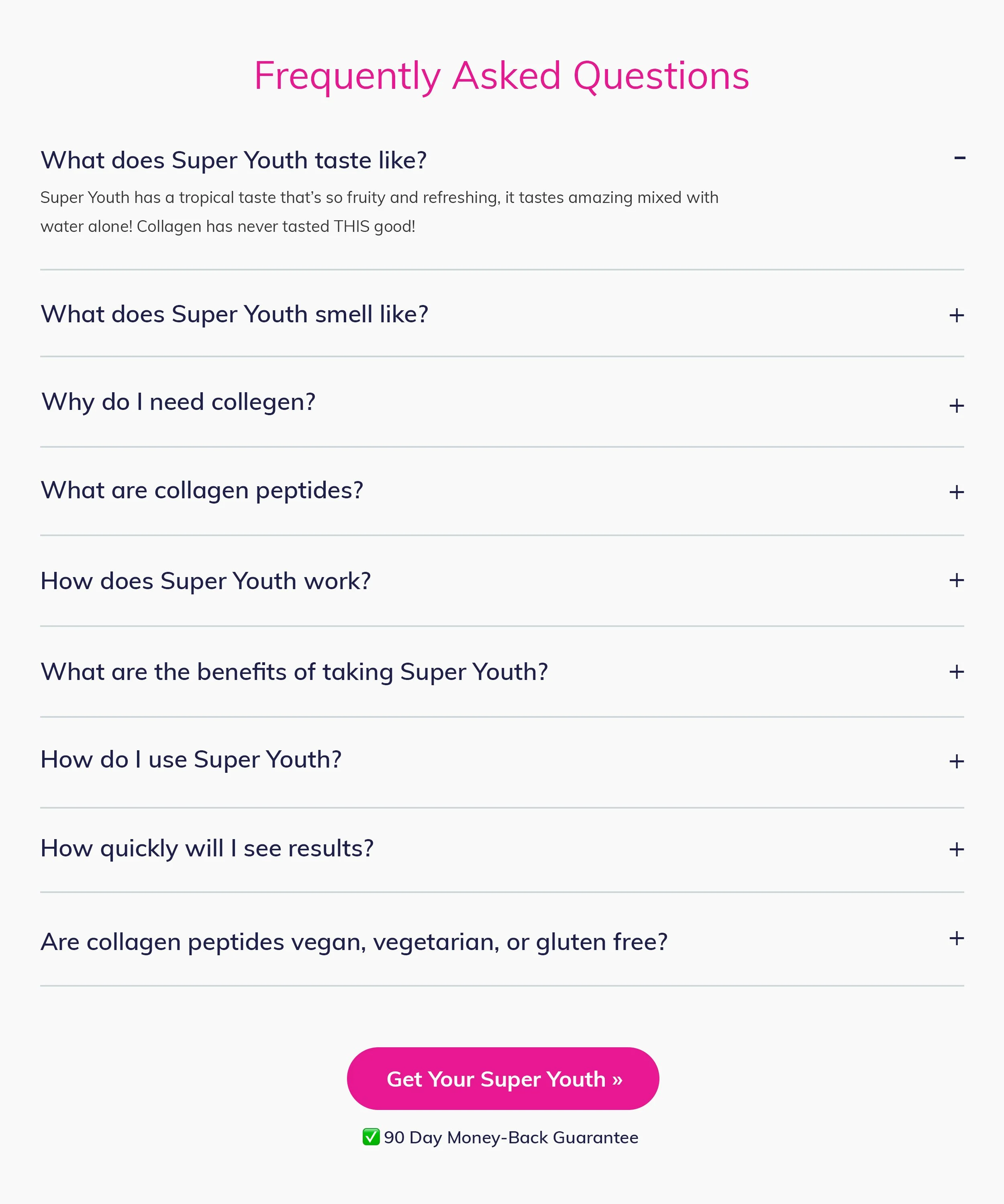 The testimonials section was moved to section 2 to build trust early in the user journey. Before & after photos are some of our strongest-performing assets in direct response, so highlighting three real customer transformations immediately validates the product’s weight-loss and skin benefits. Featuring these results near the top of the page boosts credibility, sets clear expectations, and gives users the confidence to continue scrolling and learn more about how the product works.